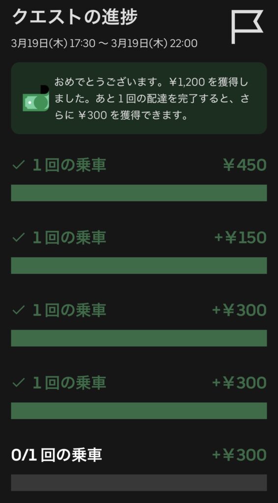 ウーバーの高額クエスト(ピークタイム4,000円)が7日連続で来たこともあり、3月はほぼウーバーの稼働です。