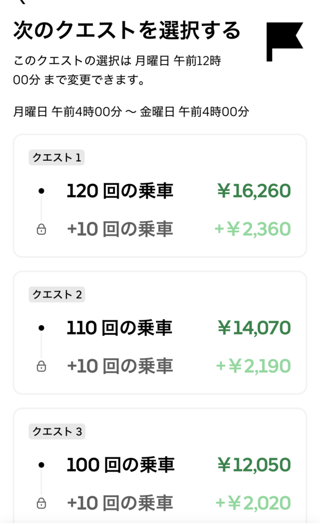 なので、ピークタイムのクエストの金額が微妙な場合は、他社を使うなど立ち回りを考える必要があります。